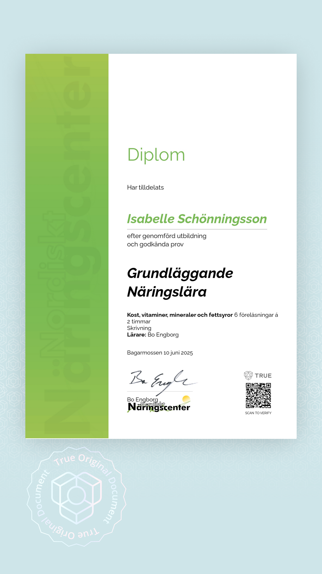 Alla TRUE -document är säkrade med blockchain-teknologi och kan verifieras som äkta. Klicka på verifieringsknappen bredvid dokumentet eller skanna QR-koden med din smartphones kamera. Ingen app krävs - dokumentets äkthet verifieras omedelbart.